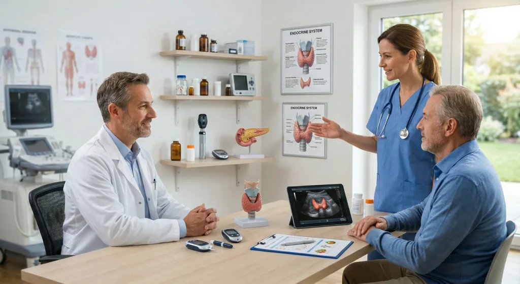 تشخيص وعلاج اضطرابات الغدة الدرقية، الغدة النخامية، والكظرية واضطرابات الهرمونات.